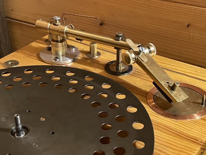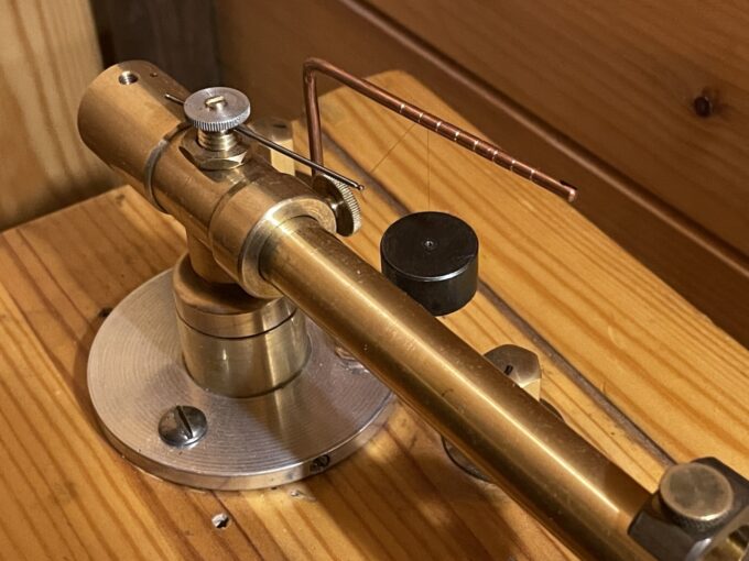 Из Энергофона было убрано все, что ранее было сделано для экспериментов со стерео, упразднен переключатель входов, перепаяны все сомнительные соединения так, чтобы при застывании припоя входной провод находился под выходным и таким образом направленность в припое правильно формировалась от выхода к входу. За время, прошедшее с последнего апгрейда Энергофона накопились новые, интресные по звуку материалы: в нескольких местах был заменен крепеж — латунные винты нарезаны старым метчиком, сонаправленным с заготовкой, кантилеверы иголок сделаны из более звучной бронзы, улучшена конструкция антискейта, необходимого для прижима к менее изношенной стороне канавки 78 пластинки (включая правильное направление волоса на котором прикреплен груз). В шелле сделана регулировка степени демпфирования основного резонанса кристалла (регулятор виден на фото), заменена пара электролитов в анодном питании, изменена схема стабилизатора напряжения накала RE11, уточнена последовательность разводки земель на шине и тд.